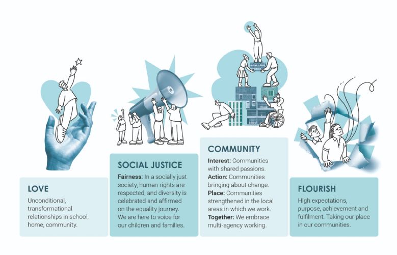 To improve outcomes for the most disadvantaged children and their families in education communities, based on the foundation stones of love (person centred, empathy, compassion, care), flourishing (high expectations, purpose and fulfilment; pushing forward, emerging, transforming and achieving), social justice (fairness as it manifests in society: that includes fairness in education, healthcare, employment, housing and more. In a socially-just society, human rights are respected, and diversity is celebrated and affirmed, and the equality journey is achieved by monitoring and intervention) and community (Interest – communities with shared passions, Action – communities bringing about change, Place – communities strengthened in the local areas in which we work).